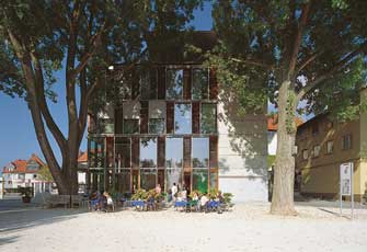 ""Es ist," so beurteilte die Jury des Architekturpreises Beton das Gebäude, "ein deutliches, selbstbewußtes Zeichen im Stadtraum und folgt in seiner Nutzung als Geschäfts- und Wohnhaus dem urbanen Zusammenhang." Das äußere Gesicht und die innere Gliederung spiegeln sich in den Materialien wider. Sichtbeton gestaltet die raumabschließenden Wände, Holz und Glas die transparenten Teile.... Die Details sind im Sinne der Aufgabe dienend eingesetzt." ... aus Beton Prisma 73/1997