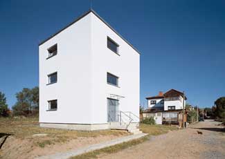 "Auf den ersten Blick mag vielen dieses Haus als zu einfach erscheinen. Zweifel mag der eine oder andere auch haben, ob es sich einfügt. Aber gerade diesen beiden Aspekte überzeugten die Jury des Architekturpreises. Sie fanden es sogar mutig, in dem heterogenen Umfeld ein solch bescheidenes Haus zu entwickeln." ... aus Beton Prisma 73/1997