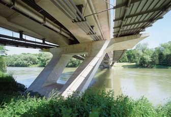 ""Wenn der Entwurf grundsätzlich steht und folgerichtig ist," so die Entwurfsverfasser, "also hier insbesondere mit den beiden Werkstoffen Beton und Stahl richtig umgeht - Beton für die gedrückten Bauteile und die schweren Widerlager, Stahlseile für die Zugbänder" - dann entwickelt sich alles wie von selbst: "Die Formen der Stützen, die hier sehr anspruchsvoll sind, weil die Brücke die Donau schiefwinklig quert, das dünne Geh-/ Radwegeband, die Übergänge der Wege ins Gelände, die Unterführung der Wälle, bis hin zu allen Details der Seilkonstruktion"." ... aus Beton Prisma 78/2000