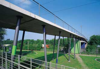 "Die multiple Brücke, so die Jury, ist ein lebendiger und unkonventioneller Beitrag zur Gestaltung einer infrastrukturellen Aufgabe. Sie stellt die herkömmliche Lögik des Konstruierens in Frage zugunsten einer expressiven Gestltung, die sowohl beim Vorbeifahren im Auto als auch bei der fußläufigen Überquerung der Brükc als überraschend empfunden wird. .... Und es entsteht, wie die Architekten feststellten, " ein räumlicher Dialog zwischen künstlich gefalteter Landschaft und dem gewellten Betonteppich"." .... aus Beton Prisma 81/2002