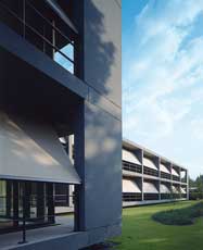 "Die ruhig in die Landschaft gestellten Baukörper werden von der konsequenten Gliederung der Fassaden bestimmt. Die liegenden Öffnungen, die zugleich das konstruktive Raster zeigen, formen die Struktur des Gebäudes. Eine zweite, dahinterliegende Ebene mit der Glasfassade bewirkt eine starke Plastizität, die für die Verschattung genutzt wird. Überzeugend ist die klare Grundrissstruktur, die mit ihren flexiblen Raumzuschnitten viele Alternativen zulässt. Der Einsatz großflächiger Betonfertigteile unterstreicht den großzügigen Charakter der Gesamtanlage und ihrer harmonischen Proportionen. Der landschaftliche Bezug mit vielen Durchblicken und den akzentuierenden Höfen vermittelt eine besonders beispielhafte Arbeitsatmosphäre." ...die Jury des Architekturpreises Beton 2005