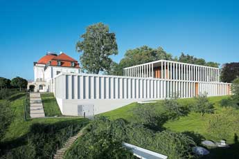 "Als „Akropolis der Literatur“ behauptet sich der Neubau auf der Anhöhe neben dem dominanten Schiller-Nationalmuseum und einem Ensemble von Solitären. Auf dem Hanggeschoss steht der Eingangspavillon, ein an den Parthenon erinnernder „Umgangstempel“ mit schlanken Betonpfeilern in enger Taktstellung und ergänzenden, großen Terrassen, die den Blick ins Tal ermöglichen. Mit gelassener Würde präsentiert sich das Museum dem ankommenden Besucher. Im Inneren führt ein Treppenlauf hinab ins Sockelgeschoß zu den mit Tropenholz ausgekleideten Schauräumen." ...die Jury des Architekturpreises Beton 2005