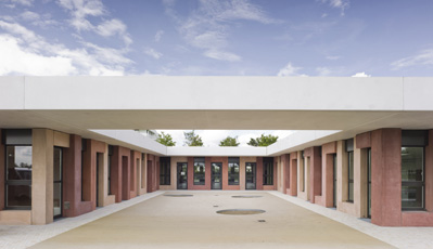 Der Entwurf der Grundschule ist visionär. Über die räumliche und architektonische Organisation eines vorbildlich funktionierenden Schulbetriebs hinaus wird den Nachnutzungsvarianten bereits bei der Entwurfsplanung besonderes Augenmerk gewidmet. Über die jetzige Schülergeneration hinaus werden völlig andere Nutzungen in dem Gebäude stattfinden - und dabei ist weit mehr möglich als die Umnutzung in ein Bürogebäude. Die größtmögliche Grundrissflexibilität wurde durch eine Reduktion der tragenden Innenkonstruktion auf ein Minimum erreicht. Zusätzlich erlaubt die massive Stahlbetondachkonstruktion variable Anschlussmöglichkeiten für zukünftige Innenausbauten. Der Entwurf der Architekten weist damit den Weg für die Herausforderungen aktueller Gebäudeplanungen. Zugleich fällt die atmosphärische Dichte des Gebäudeentwurfs auf. Die verschiedenfarbig gestalteten Sichtbetonfertigteile erzeugen eine sympathische Grundstimmung; die Plastizität der Fassade vermittelt Sicherheit und Vertrauen.