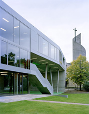 Die Gebäudekonstruktion selbst ist ausgesprochen vielschichtig; sie entspricht der Nutzung und ist dieser jeweils zu-, aber auch untergeordnet worden. Die Gebäudehülle folgt der Idee einer Karosserie, das Freilegen und die Schnittmengen derselben sind Annäherungen an die umgebenden Frei- und Grünflächen. Funktionale Anforderungen, aber auch viel Sensibilität und Gefühl prägen die Entscheidungen für den rohen Beton, die metallische Härte oder die Glattheit von Farbflächen. Für das Innere wurde die Idee der „promenade architecturale“ zitiert und in der Tat sind es auch hier wieder Elemente der Bewegung, denen es gelingt, bei aller Vielfalt Zusammenhänge herzustellen. Schön und erfrischend ist es, wenn genau das gelingt und sich der Nutzer nicht nur im Inneren verankert fühlt, sondern auch als Teil eines sozialen Kontextes, in der Stadt und mit seinen Bewohnern. Genau dafür bietet das Haus der Jugend die richtige Architektur.