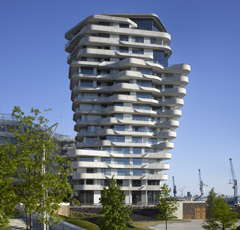 Der Wohnturm markiert eine zentrale Stelle der neu entstandenen Hamburger Hafen City. Dabei wird das skulpturale Gefüge der Bedeutung des Standortes gerecht, ohne in modische Spielereien zu verfallen. Das Gebäude wirkt auf angenehme Weise maritim und zeitlos. Die Schichtung der Geschosse lässt den Turm von allen Himmelsrichtungen anders erscheinen. Zugleich werden individuelle Freiräume geschaffen. Damit entsteht ein zentrales Element für die von den Architekten angestrebte Interpretation der Wohnform „Villa mit Garten“. Die erreichte Wohnqualität überzeugt. Schwingende Terrassen mit Betonbrüstungen geben dem Turm seine besondere Dynamik. Sie verschatten die Fassaden soweit, dass auf einen konventionellen außenliegenden - und damit windanfälligen - Sonnenschutz verzichtet werden konnte. Vakuumkollektoren auf dem Dach wandeln solare Gewinne mittels eines Wärmetauschers in Kälte um und sorgen so für umweltverträgliche Kühlung.