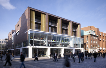 Die oberen, neu errichteten Geschosse sind dem Wohnen vorbehalten. Dabei ist den Architekten zweierlei gelungen: dem Wohnen in der Innenstadt wird ein qualitätvoller Rahmen gegeben, der Gemeinschaft und Privatheit gleichermaßen ermöglicht und auch für Familien geeignet ist. Zugleich wird eine adäquate, städtische Antwort bei der Entwicklung von Baukörper und Fassade gefunden, die dem Gebäude Eleganz und urbane Grandezza gibt. Die Mischung der prägenden Materialien Ziegel - entsprechend den Vorgaben der Münsteraner Altstadtsatzung - und helle, präzise hergestellte Betonfertigteile mit Glasflächen ist gelungen. Ein charaktervoller Stadtbaustein ist entstanden.