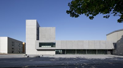 Mit seinen schwer aufeinander lagernden, plastisch ausgebildeten Betonkörpern wirkt das Instituts- und Forschungsgebäude der TU Chemnitz fast wie ein Neubau. Dabei stammt der Hauptbaukörper - eine ca. 170 m lange, markante Scheibe - aus dem Jahr 1970. Er wurde beim Umbau durch Burger Rudacs Architekten bis auf die Stahlskelettkonstruktion rückgebaut und um zwei Geschosse reduziert. An der Stirnseite des Bestandsbaus schließt ein neues Hörsaalgebäude an und bildet das Entree und neue Gesicht zum Campus. Durch ebenfalls neu errichtete Fluchttreppenhäuser an beiden Enden des Bestandsriegels gelingt die tektonisch stimmige Zusammenfügung der einzelnen Baukörper zu einem monumentalen, harmonisch proportionierten Ensemble. Großformatige, vorgefertigte Sichtbeton-Sandwichelemente in verschiedenen Grautönen lassen Alt- und Neubauten skulptural und wie aus einem Guss erscheinen. Dabei bilden die unterschiedlich ausgebildeten neuen Fassaden des Bestandsbaus dessen asymmetrische innere Struktur mit nach Süden orientierten Büroräumen und nach Norden angeordneten, tieferen Labor- und Seminarräumen ab. In der Höhe verspringende Fensterbänder auf der Südseite und unterschiedlich breite Fensterformate im Wechsel mit betongrauen, perforierten Blechpaneelen zur Verblendung der Lüftungsflügel auf der Nordseite brechen die Strenge des bestehenden Konstruktionsrasters auf und lassen die Ansichten flächiger erscheinen. Durch die farblich abgestimmten unterschiedlichen Materialien entsteht je nach Lichteinfall ein changierendes Lichtspiel. An den Stirnseiten wird die individuell reagierende Fassadengestaltung elegant wieder miteinander verwoben.