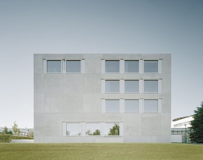 Weit entfernt vom Schematismus vieler Fertigteilbauten zeichnet sich das aus vorgefertigten Stahlbeton-Sandwichelementen errichtete Seminargebäude auf dem Hochschulcampus in Stuttgart-Vaihingen durch seine schlichte, einprägsame Eleganz aus. Die Fertigteilelemente des Solitärs sind präzise gefügt, die Betonoberflächen von samtiger und ebenmäßiger Textur. Fensterprofile und Öffnungsflügel aus Metall bleiben in der minimalistischen Farbskala der hellgrauen Sichtbetonhülle, die Fensteröffnungen sind einheitlich groß und quadratisch, tragen in ihrer asymmetrischen Anordnung aber entscheidend zum Eindruck der klaren, rationalen Architektur, die auch dem Spielerischen Raum gibt, bei.