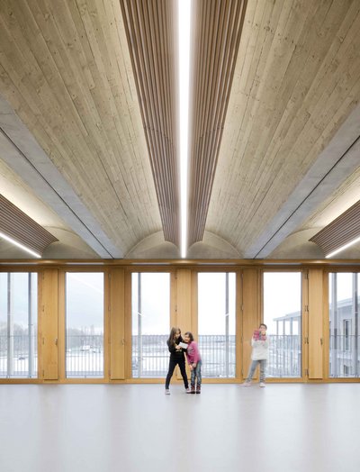 Das Projekt zeigt, dass serielles Bauen in hoher Qualität und Präzision möglich ist: Die Schule lebt durch ihre Atmosphäre, bis hin zur besonderen Lichtstimmung und Akustik, Identitätsstiftend wirkt die serielle Tonne, sie bringt Raum und Charakter. Ein guter Ort zum Lernen.