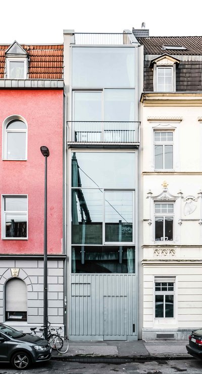 Die Dimensionen des Hauses in Köln-Ehrenfeld sind äußerst knapp bemessen: 10 x 3 Meter. So entstand ein Haus über sechs Etagen, samt Keller und Dachterrasse. Im Erdgeschoss Büro, darüber Wohnräume mit Blick auf die Gleise. Dazwischen Schlafräume und Bad. Mit seinen Treppen und Lufträumen wirkt das Haus großzügiger, als es nach den reinen Zahlen ist. Räume haben hier eine andere Funktion, sie liegen immer im Dazwischen.