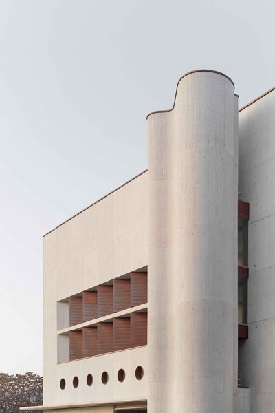 Die Architekten gaben dem in der Nachkriegszeit aus den Fugen geratenen Stadtraum wieder Halt. Das Haus nimmt die Materialität der bestehenden Württembergischen Landesbibliothek auf: Die Wandfelder der gefächerten Fassade lassen an die Kupferverkleidung des alten Lesesaals denken, Sichtbeton in feiner Bretterschalung erinnert an die 1970 von Horst Eduard Linde entworfene Landesbibliothek. Zugleich schlägt der Erweiterungsbau eine Brücke zum Sandstein der benachbarten Stirling-Bauten. Die Sichtbetonfassade ist als Ortbetonschale mit Kerndämmung vor die tragenden Betonwände gehängt.