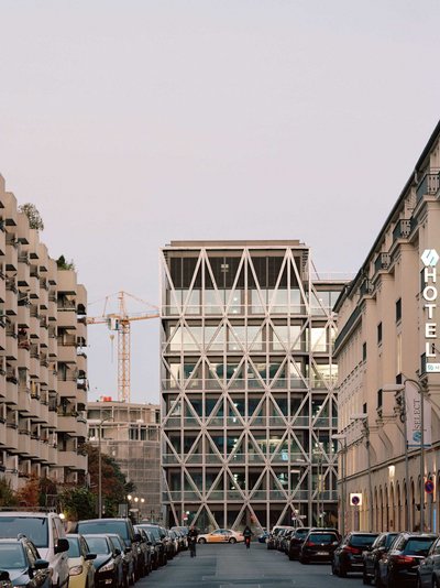 Der Baustoff Beton sorgt bei der tragenden Struktur des Gebäudes mit seinen diagonal verlaufenden Stützen für Spannung und lässt die Statik sichtbar werden. Durch die hohe thermische Speicherfähigkeit des Stahlbetontragwerks reguliert sich das Klima der Innenräume größtenteils auf natürliche Weise. In der warmen Jahreszeit kühlt der Beton nachts aus und gibt die Kühle tagsüber wieder langsam an dei Innenräume ab. Das schafft ein gutes Raumklima und eine hervorragende Arbeitsatmosphäre. Das Haus mit seinen französischen Balkonen bietet RedakteurInnen und MitarbeiterInnen die Möglichkeit, das Büro für einen Augenblick zu verlassen. Ein kluges, offenes Gebäude für eine offene Gesellschaft.