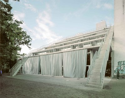 Die Struktur des Hauses bestimmt auch seine Nutzung. Es zeigt zwei klar getrennte Seiten. Nach Süden, zum Gemeinschaftsgarten, gibt es sich offen. Zur Straße ändert sich das Bild. Hier formen zurückspringende Fassaden einen überdachten Vorplatz. Über dem Restaurant im Erdgeschoss liegen Büros, gefolgt von Studios, in denen sich Arbeit und Wohnen ohnehin nicht klar trennen lassen. Die zwischen den beiden charakteristischen Freitreppen durchlaufenden Balkone lassen sich nicht so einfach privatisieren, da sie die Haupterschließung des Terrassenhauses bilden, das zu einem öffentlichen Ort wird, bestimmt durch permanente Begegnung, Austausch und Öffnung. Das Haus ist in Bewegung. Permanent. Es ist zugleich ein Mikrokosmos der scih verändernden Stadt Berlin - ein Experiment, das man genau beobachten sollte.